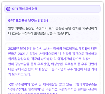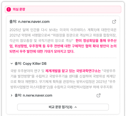 문장별 표절률, 표절 의심 영역을 직관적으로 확인할 수 있습니다.
